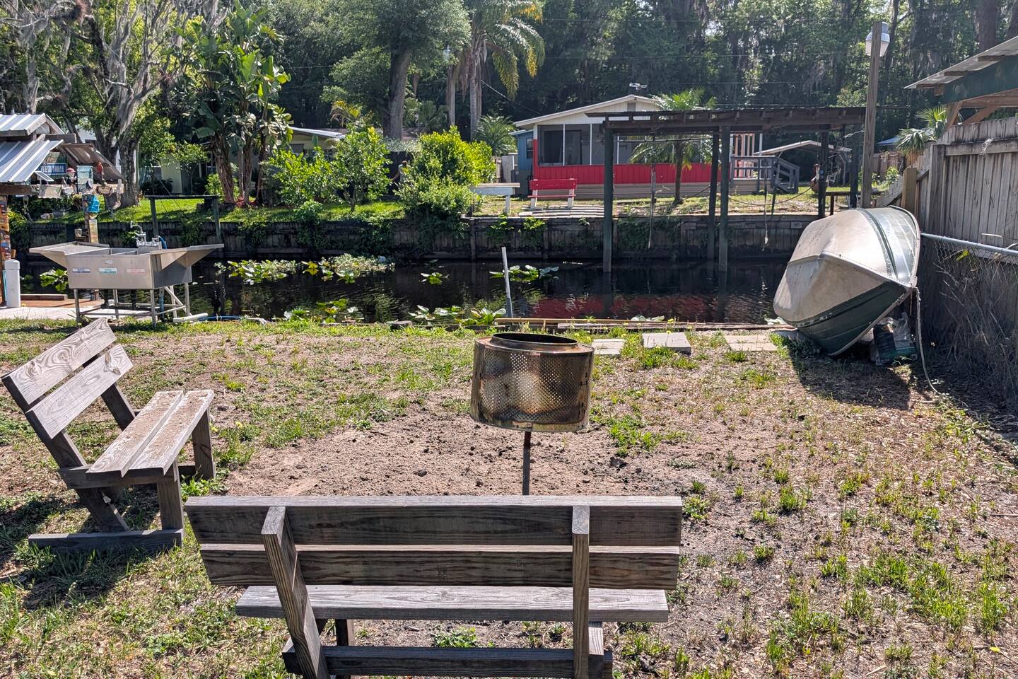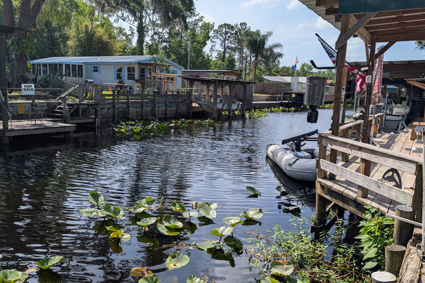2025 NEW HOME 1 Private Bedroom 1 Loft Bedroom sleeps 4 upstairs. 1 Pull-out Double Couch FULL Bathroom with stand-up shower Small Gas Grill Kitchen Full-size refrigerator Small Dishwasher ALL-in-one washer/dryer FREE 16ft INFLATABLE Boat to use for 1 day when you stay 4 days or more (extra days available) with a 20 HP 4-stroke motor (boat is shared between 2 properties but is usually available) Just a few minutes away from the Redneck Riviera, the world-famous Sand Bar is a great place to anchor and have fun. There's a canal out back where you can fish right from the property. Fire pit Plenty of parking beside the home Known as the Bass Capital, you are just a few minutes away from the St. Johns River, Crescent Lake, and even Lake George, the second largest lake in Florida. We have a fish cleaning station, a grill, a table with an umbrella, and a fire pit. There is plenty of parking beside the home for your boat or other toys! You can put the boat in the water near us and dock it behind the home if you would like. Your Satsuma getaway awaits at this charming 2-bedroom cottage. Inside, guests will find a PRIVATE bedroom with a queen bed and TV. The loft area UPSTAIRS has a KING BED (you must be fit to go up and down stairs, but it is perfect for kids!). It even has a fireplace and TV upstairs, along with a cozy living room that features a fold-out full bed and a large Internet TV. The kitchen is equipped with a GAS STOVE and OVEN, a MICROWAVE, a full-size REFRIGERATOR, and a SMALL DISHWASHER, as well as an all-in-one WASHER and DRYER. The kitchen is stocked with a Keurig and coffee pods, plus cookware and utensils.
