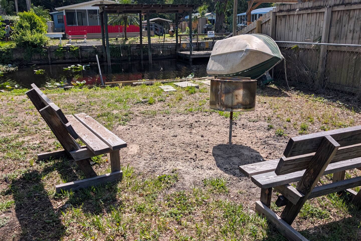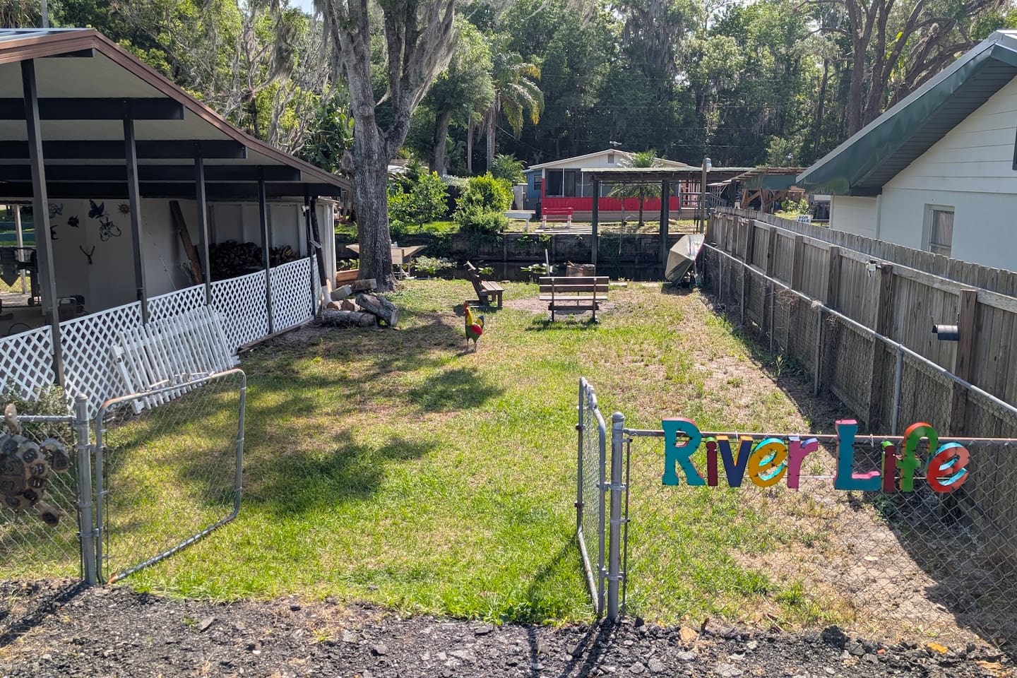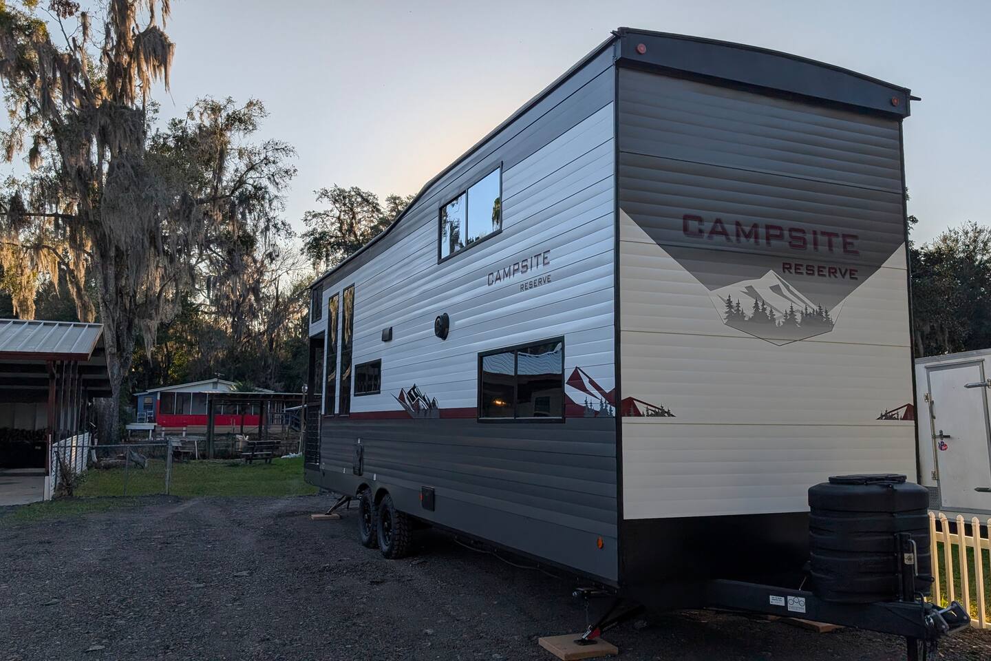 NOTE: You will be required to empty the water tanks by pulling 2 handles; it is explained in the arrival guide at the home. Pets welcome $50 per pet 1 Private Bedroom 1 Loft Bedroom that sleeps 4 1 Pull-out Double Couch FULL Bathroom with stand-up shower Small Gas Grill Kitchen Full-size fridge Small Dishwasher All-in-one Washer/Dryer FREE 16ft Boat to use You can dock your boat behind the home. grill, a table with an umbrella, and a fire pit. Many natural Springs